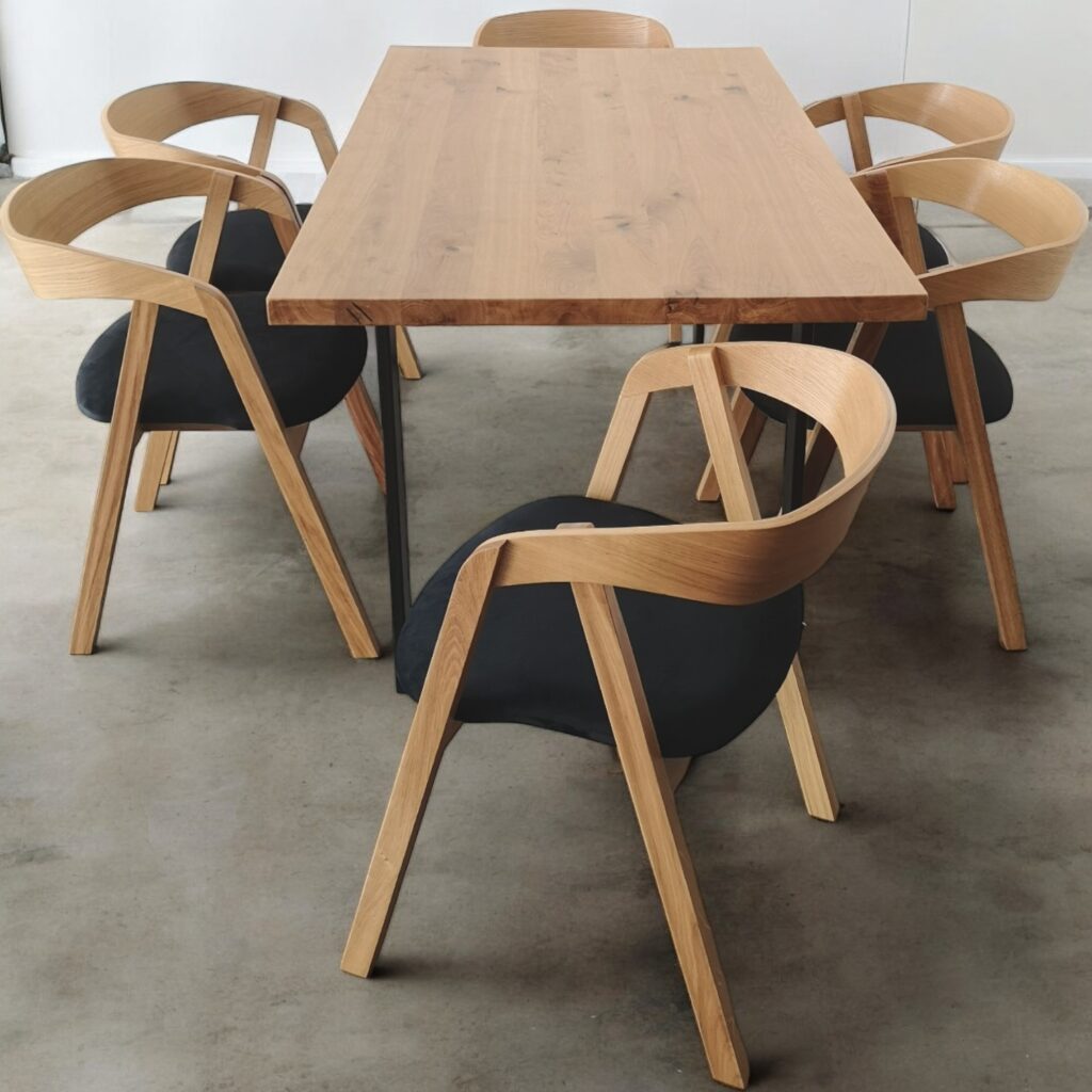 Lity blat dębowy klejony po szerokości gwarantuje trwałość, a nowoczesne metalowe nogi w kształcie litery U zapewniają stabilność i industrialny styl.