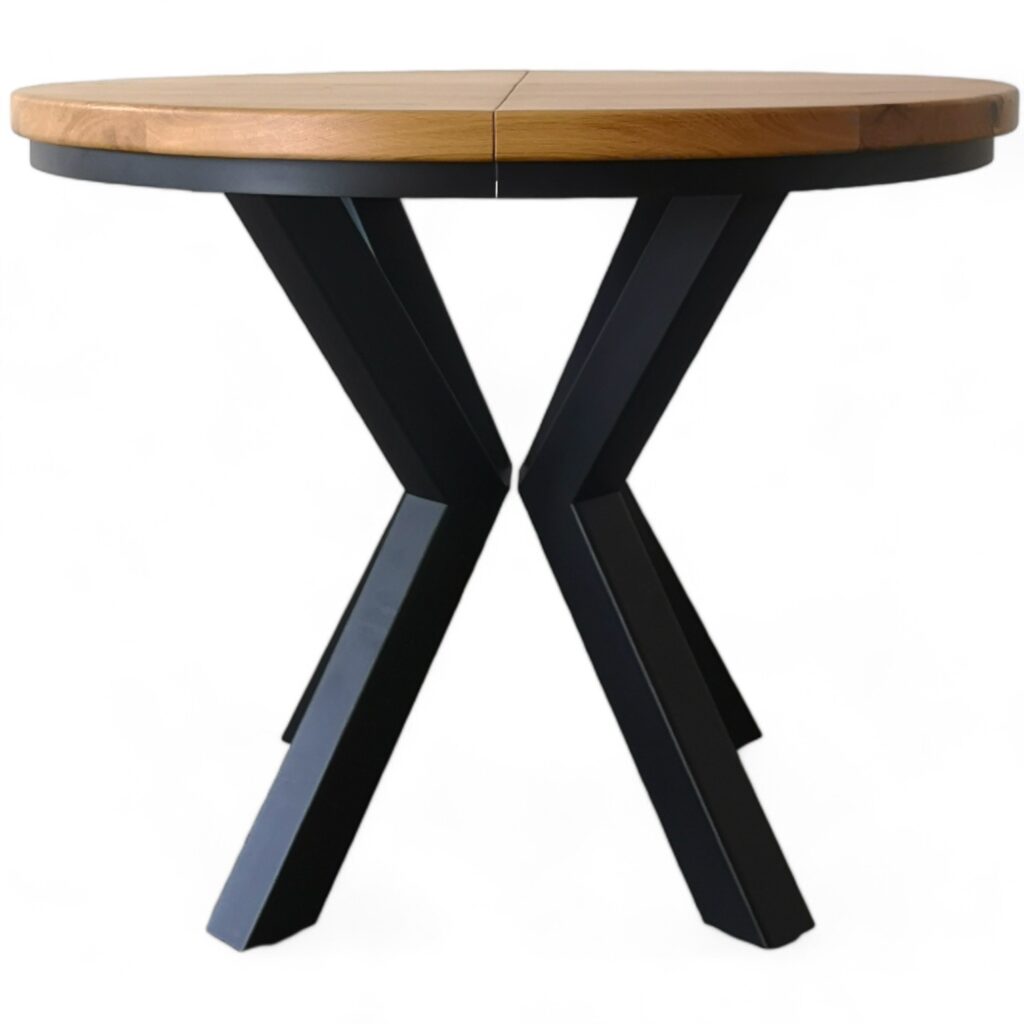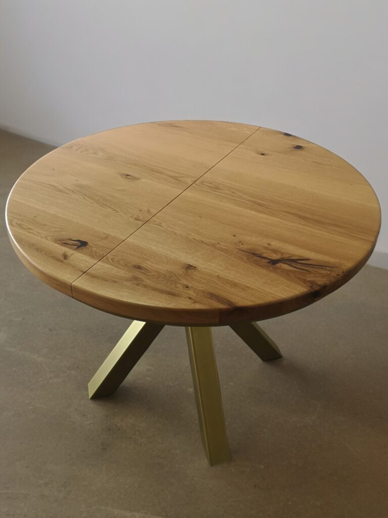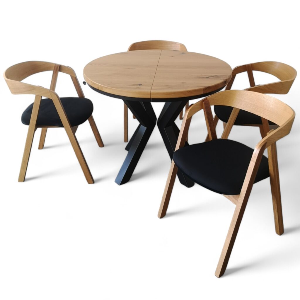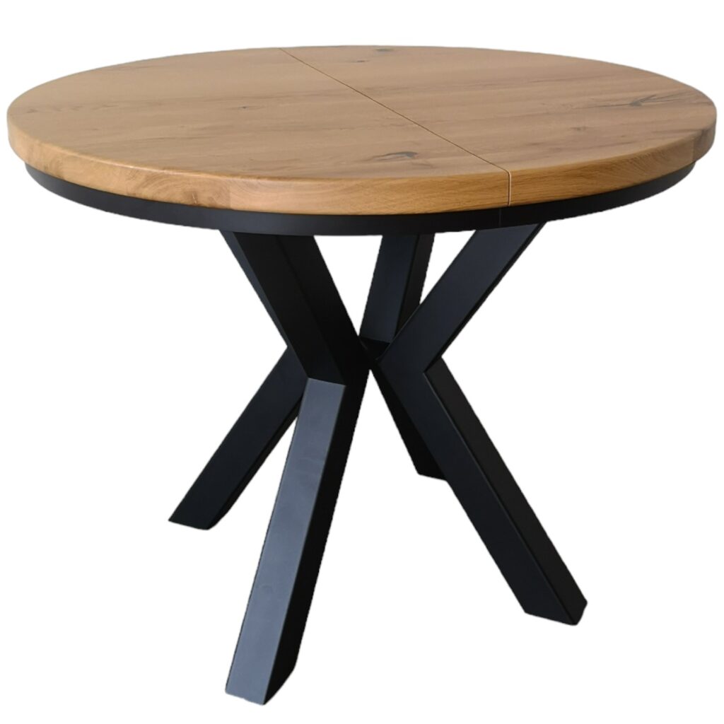 Przedstawiamy elegancki okrągły stół rozkładany na solidnych metalowych nogach, który łączy funkcjonalność z nowoczesnym designem. Ten wyjątkowy stół posiada blat z litego drewna dębowego o grubości 4 cm, wykonany z najwyższej jakości desek dębowych, które zostały starannie olejowane, aby podkreślić naturalne piękno i trwałość drewna.