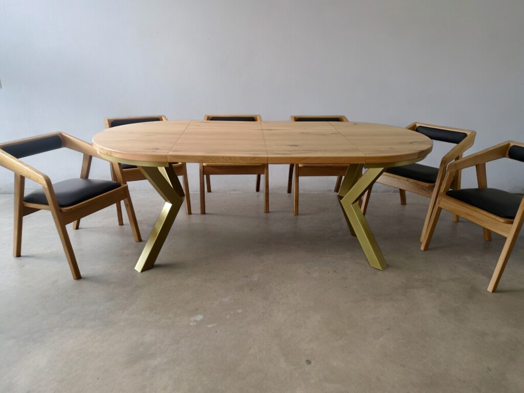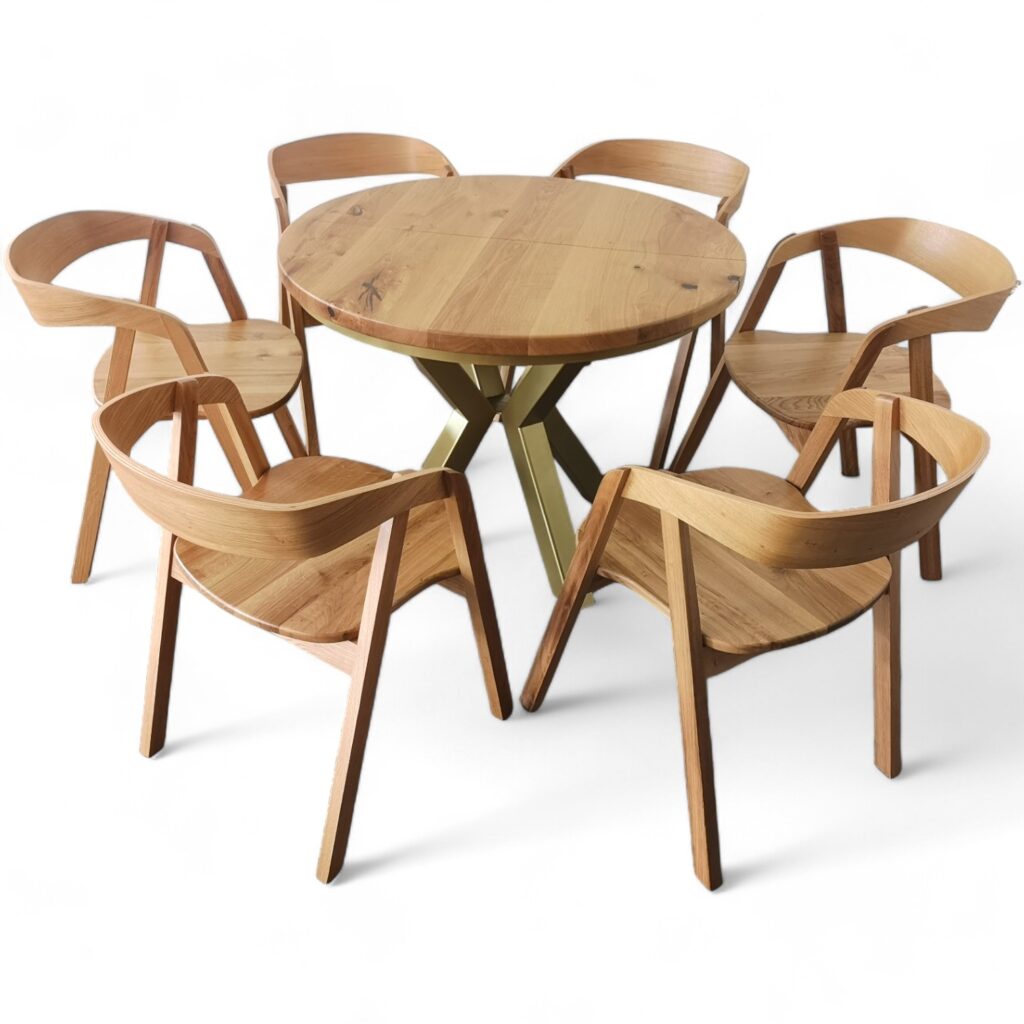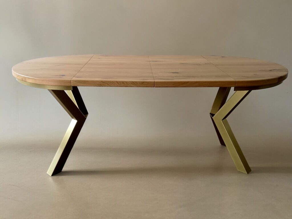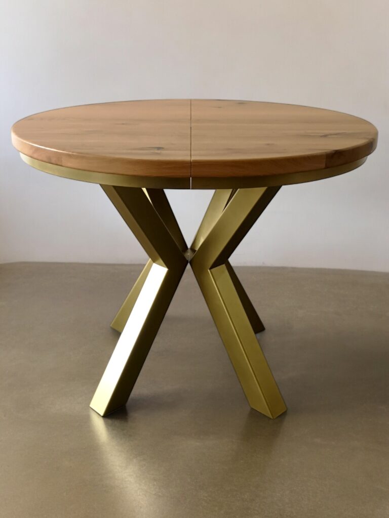 Przedstawiamy elegancki okrągły stół rozkładany na solidnych metalowych nogach, który łączy funkcjonalność z nowoczesnym designem. Ten wyjątkowy stół posiada blat z litego drewna dębowego o grubości 4 cm, wykonany z najwyższej jakości desek dębowych, które zostały starannie olejowane, aby podkreślić naturalne piękno i trwałość drewna.