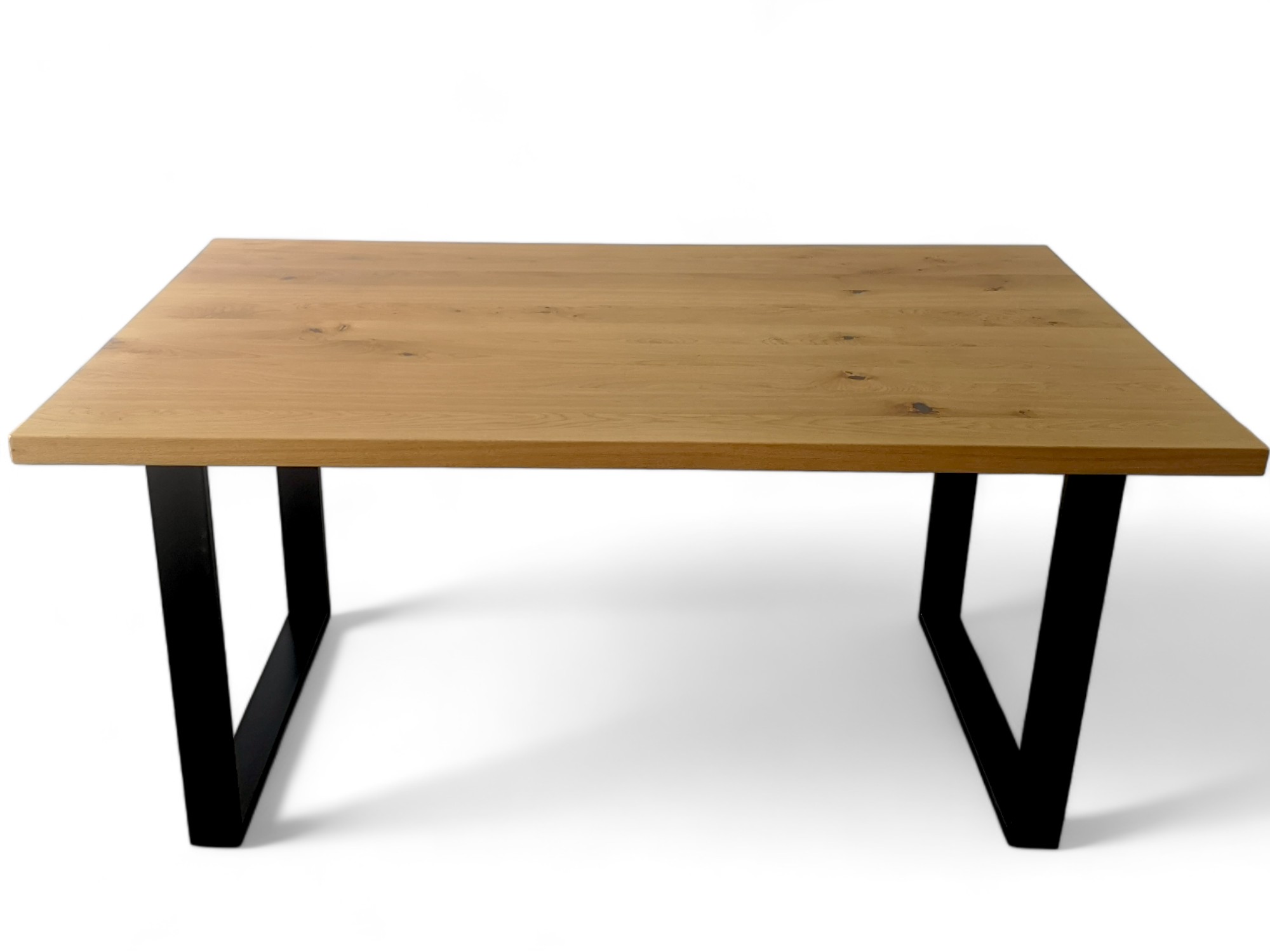 Podstawę stołu tworzą metalowe nogi w kształcie litery U, wykonane z profili o wymiarach 80×20 mm. Malowanie proszkowe na czarno sprawia, że są odporne na zarysowania i korozję, a ich nowoczesny design doskonale komponuje się z dębowym blatem. Przestronny rozstaw nóg wynoszący 115 cm gwarantuje wygodę dla użytkowników.