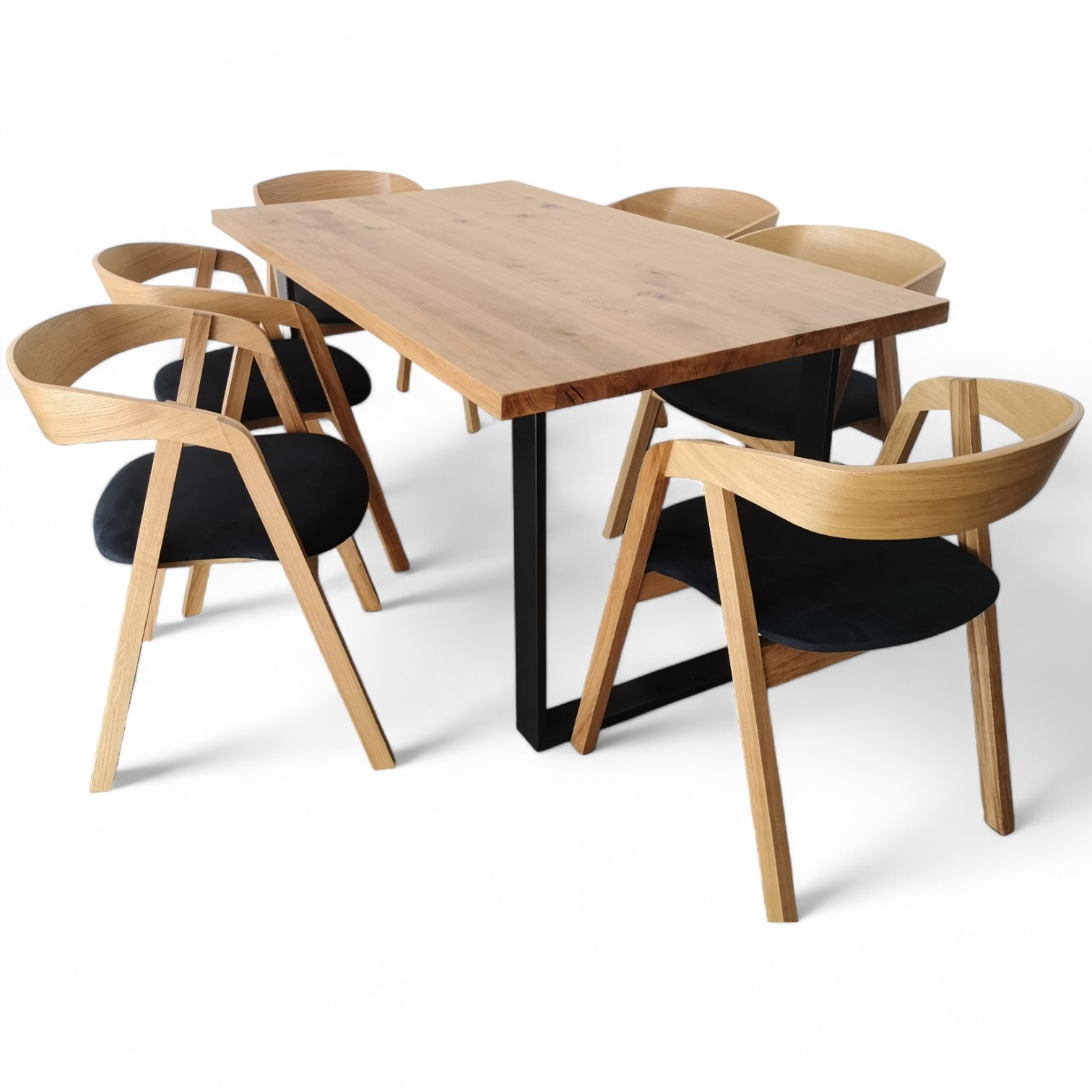 Przedstawiamy elegancki zestaw do jadalni, który łączy funkcjonalność i nowoczesny design. Zestaw składa się ze stołu dębowego na solidnych metalowych nogach S4 oraz 6 krzeseł dębowych K14 z tapicerowanym siedziskiem.